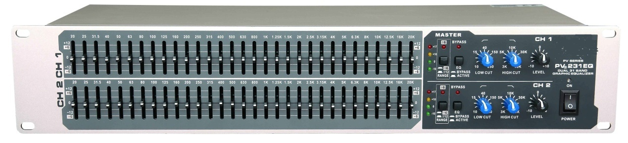 双31段,2/3倍频程图示均衡器。20Hz-20kHz可调,每段可进行6dB或12dB提升或衰减。带状态显示LED的低切滤波以消除舞台上开放式麦克的隆隆声,及带LED显示的旁路开关。